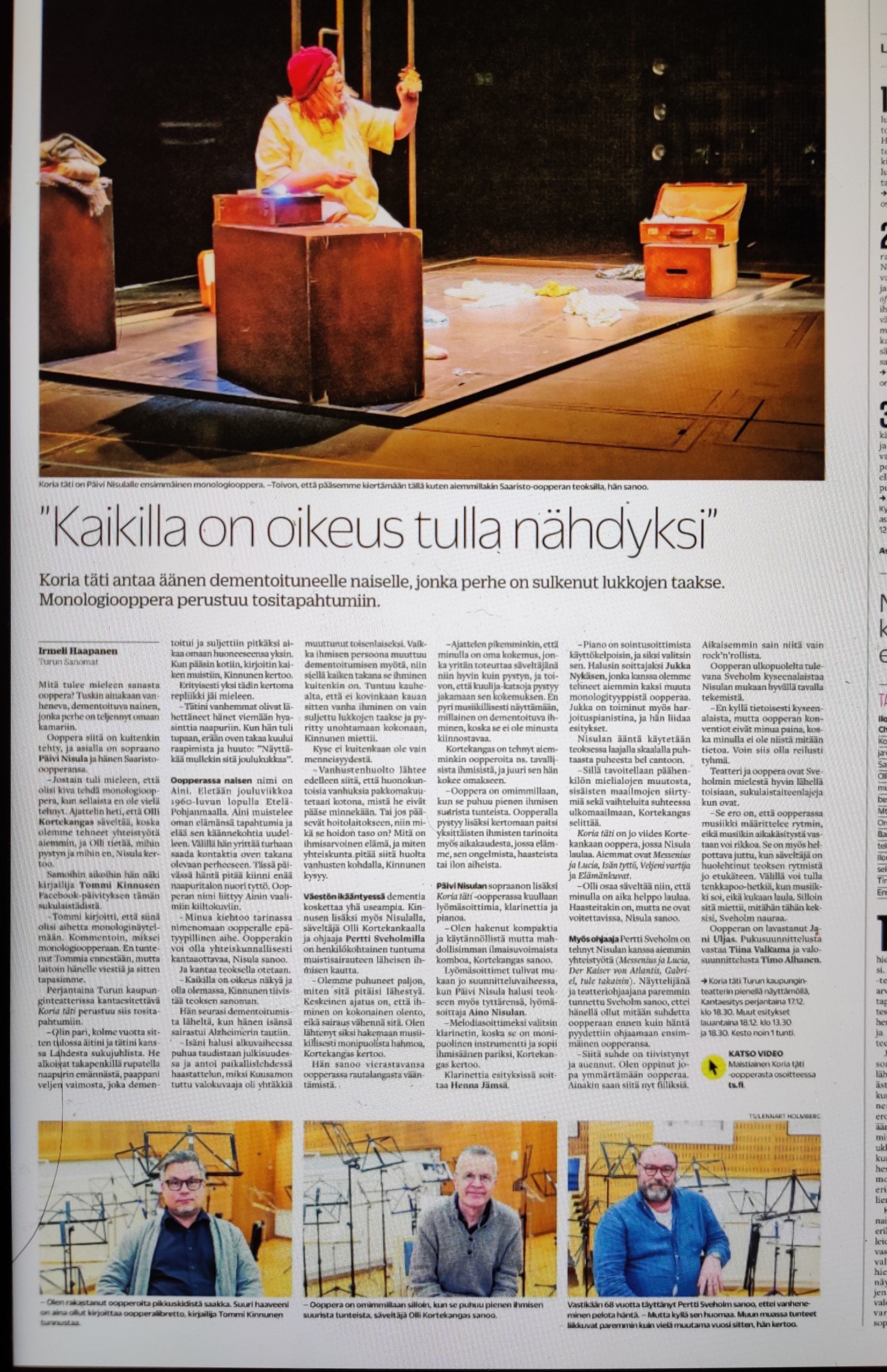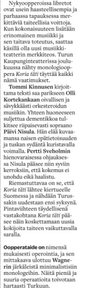 “Olli Kortekangas ja Tommi Kinnunen synnyttivät vaikuttavan oopperan hylätystä ihmisparasta – Päivi Nisulan karisma kannattelee komeasti Koriaa tätiä.” –Turun Sanomat 18.12.2021